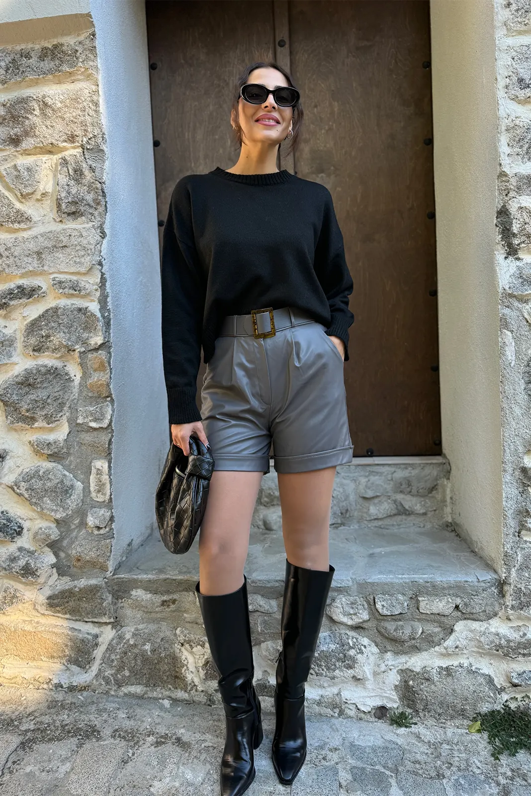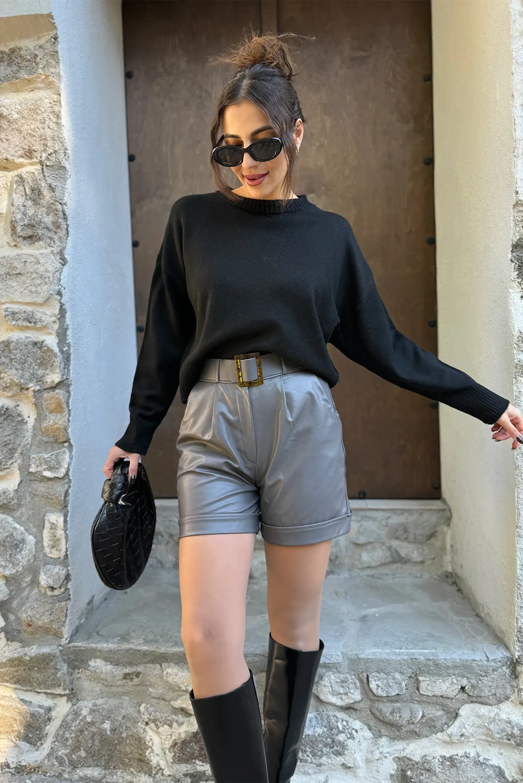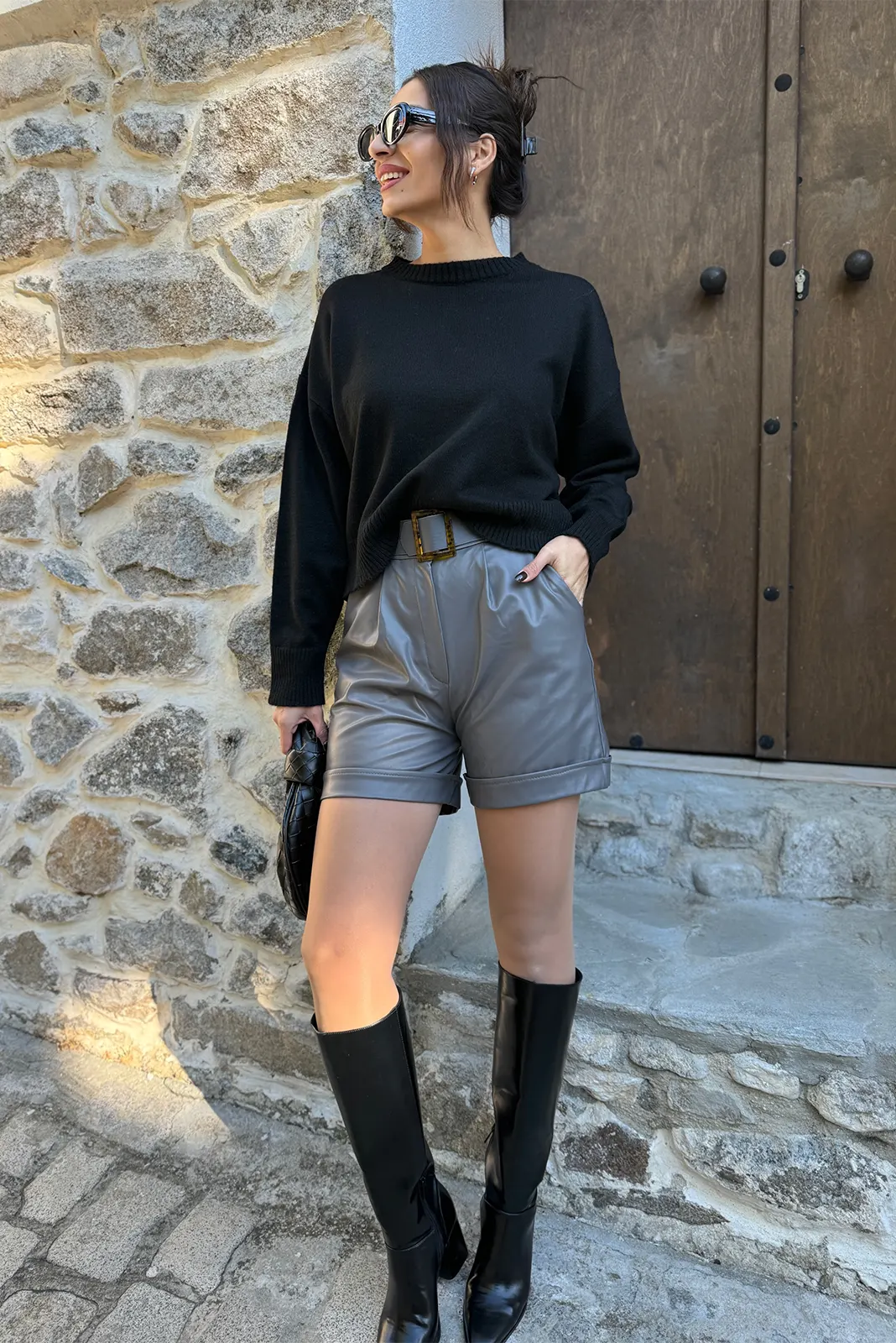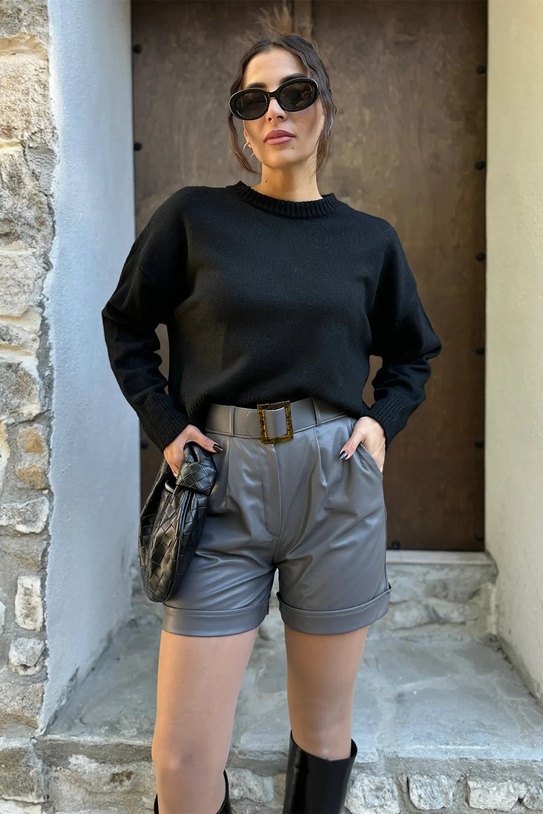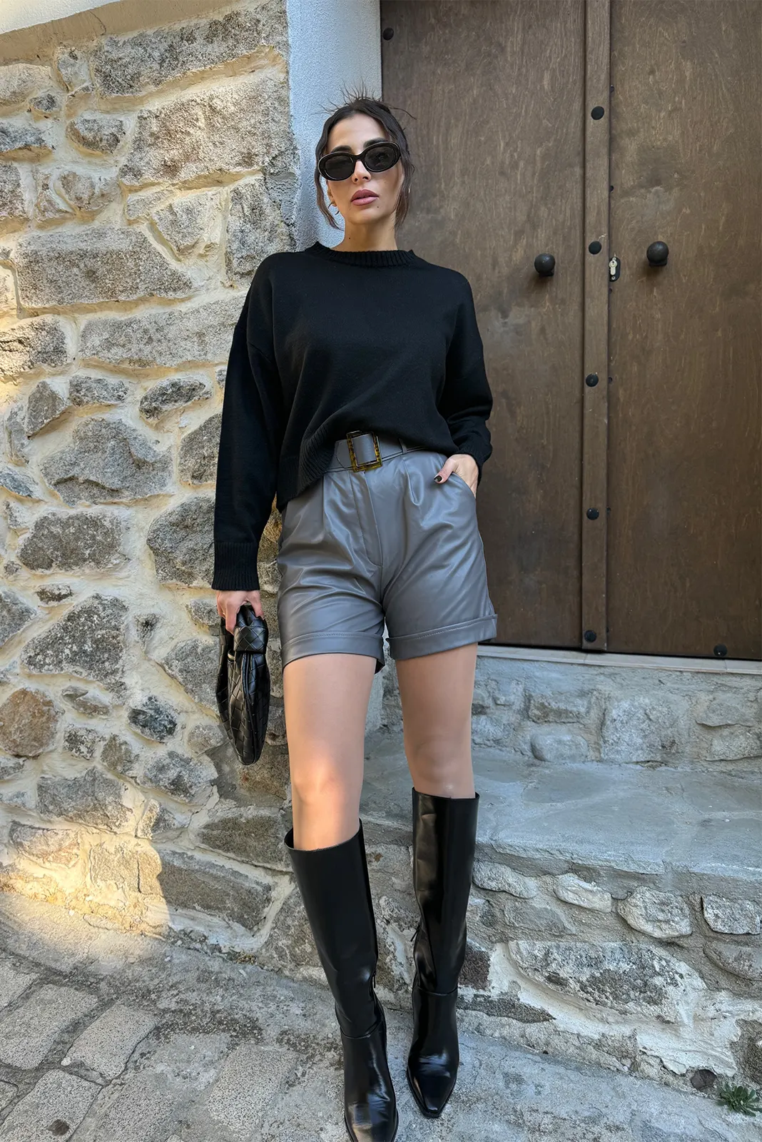 Δερμάτινο Σορτς με Ζώνη – Γκρι
