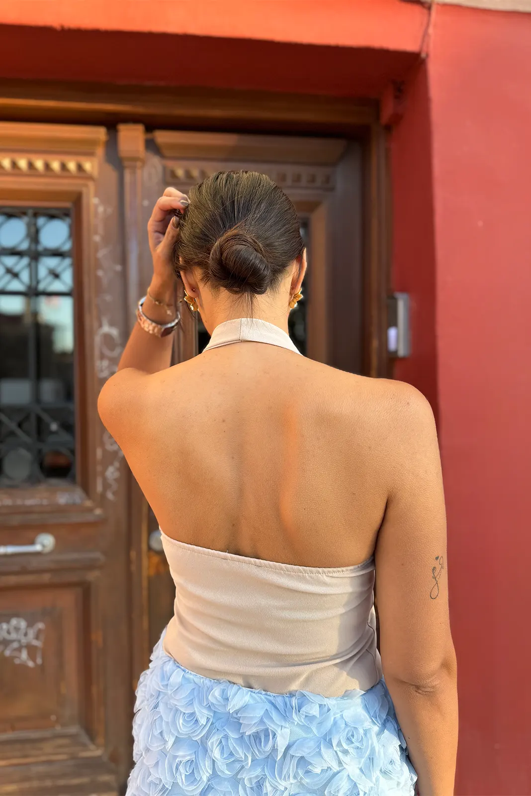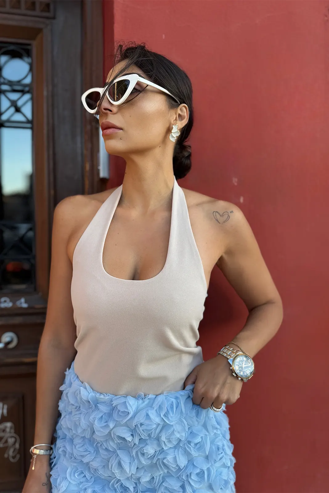 Halter Μπλούζα με Στρόγγυλη Λαιμόκοψη – Μπέζ