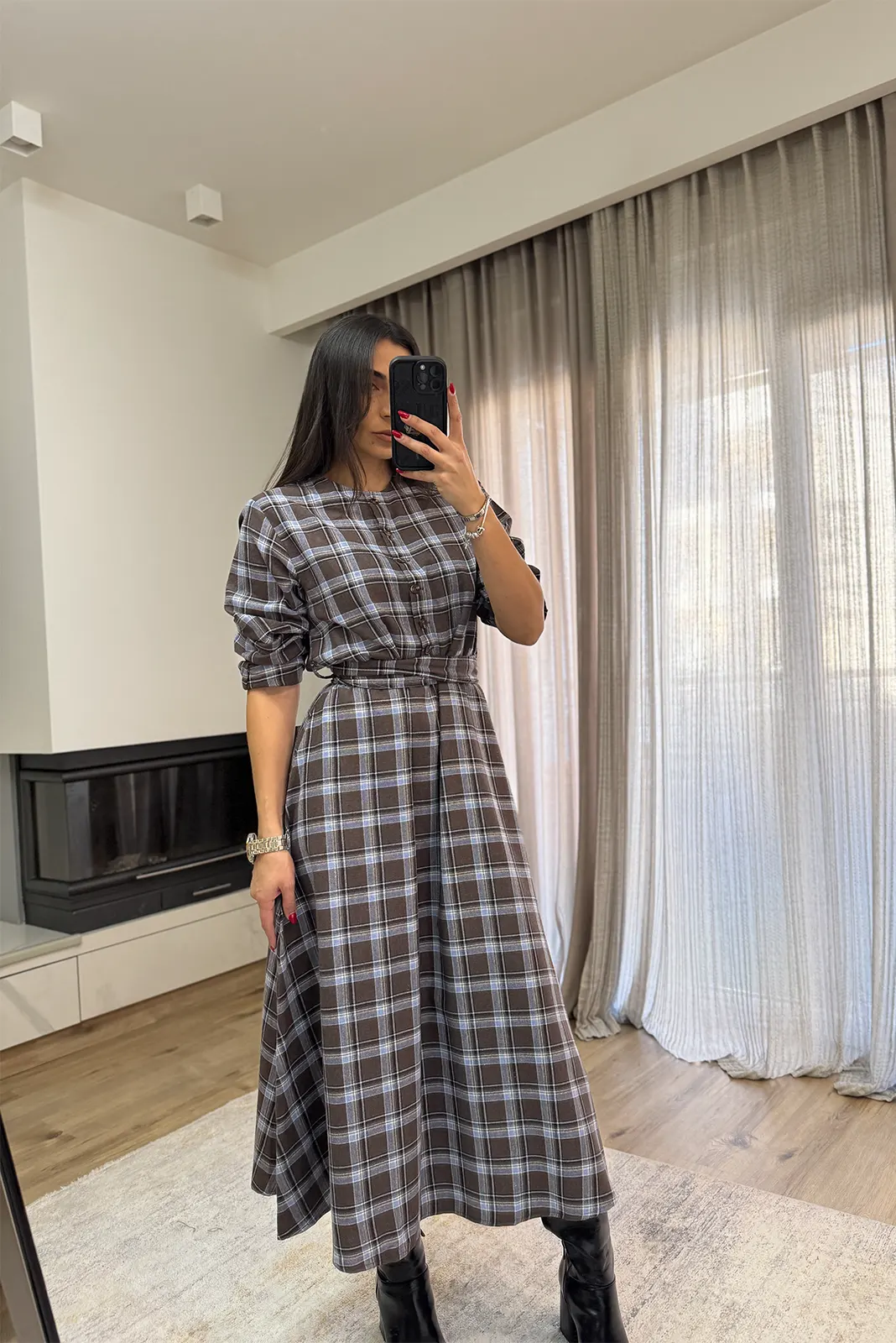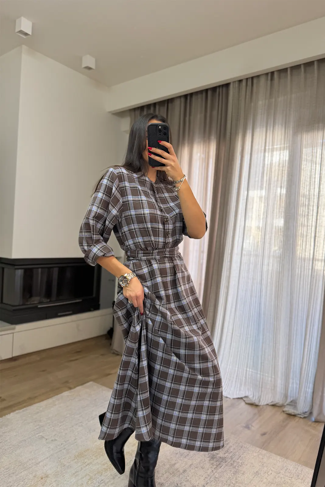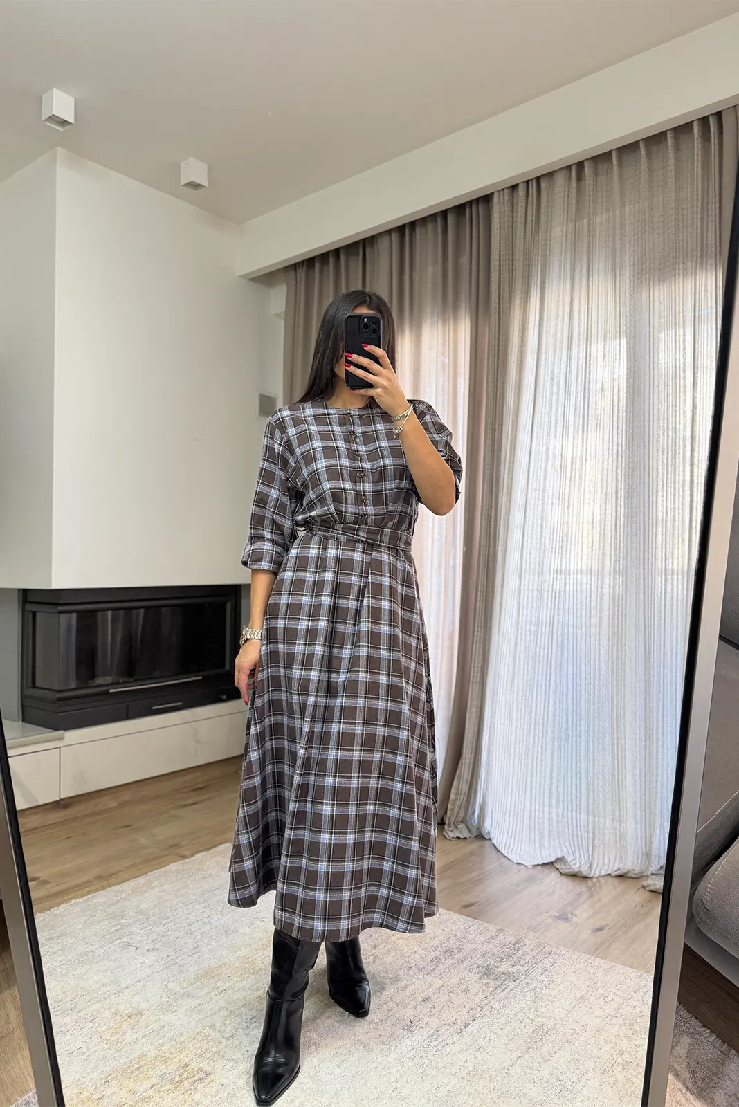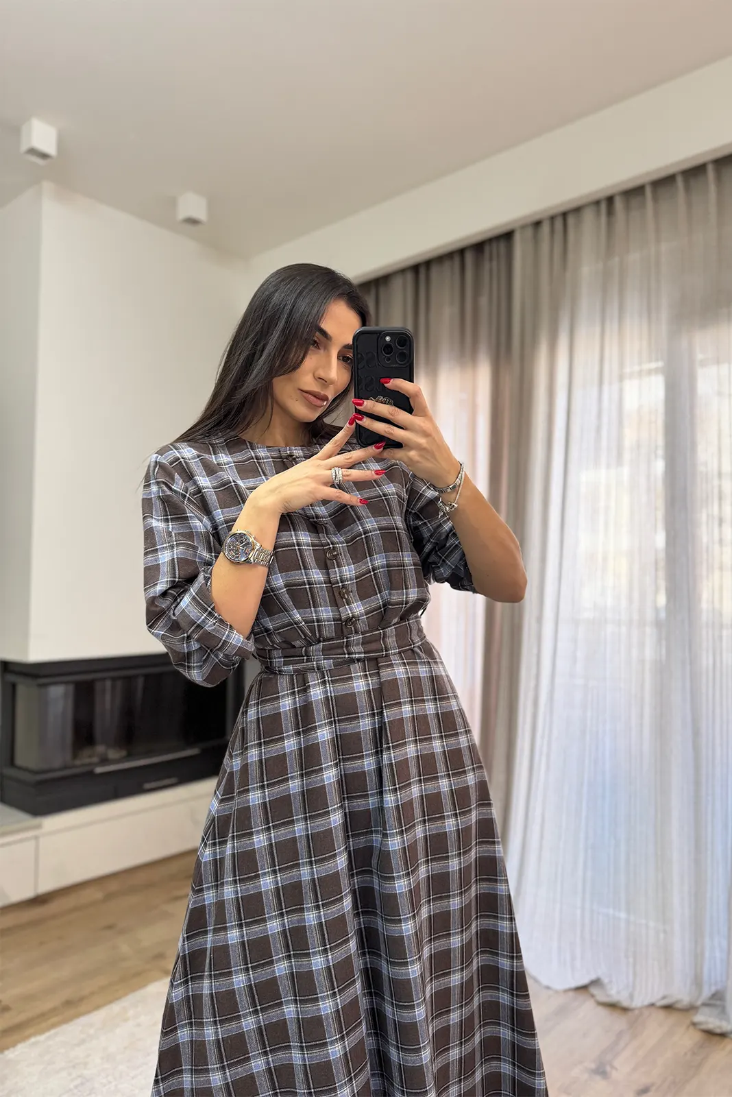 Maxi Καρό Φόρεμα με Ζώνη – Καφέ κ Γαλάζιο