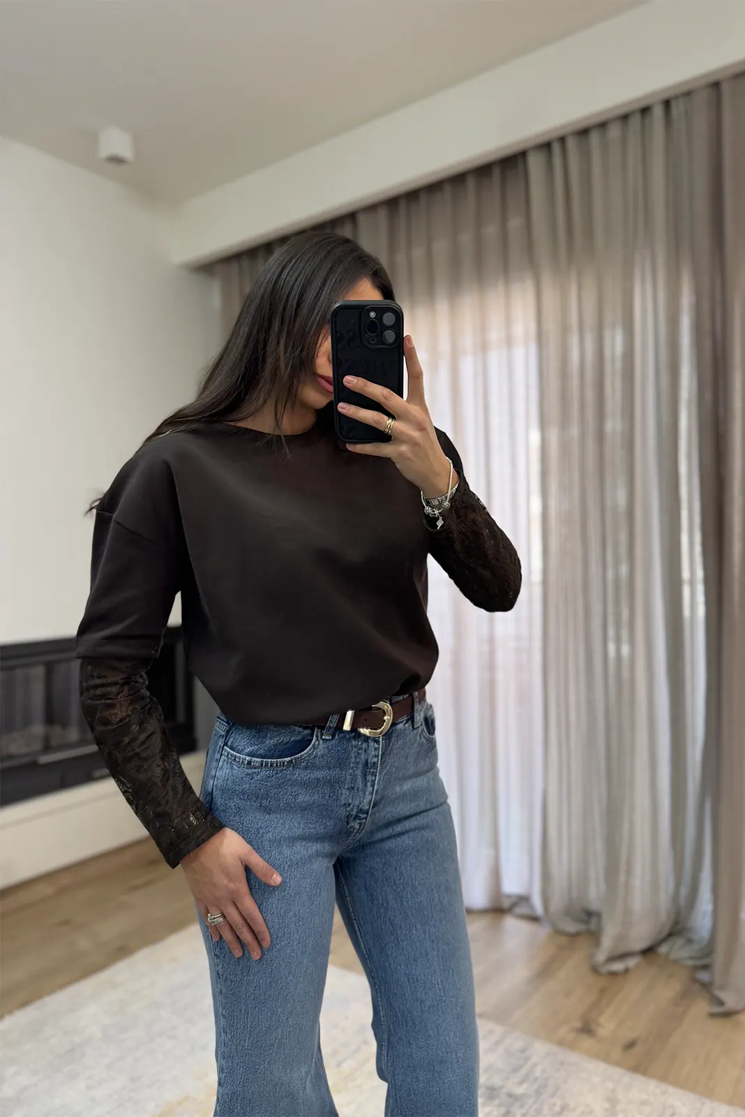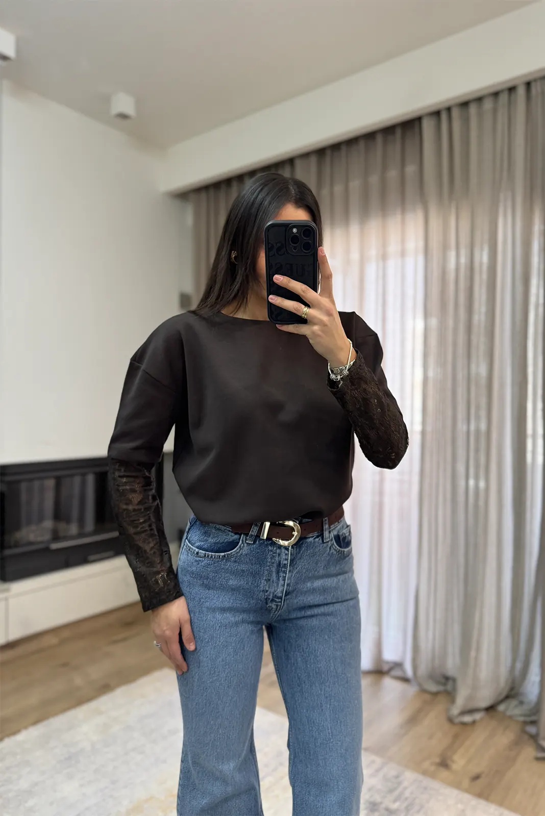 Μπλούζα με Μανίκι από Δαντέλα – Καφέ