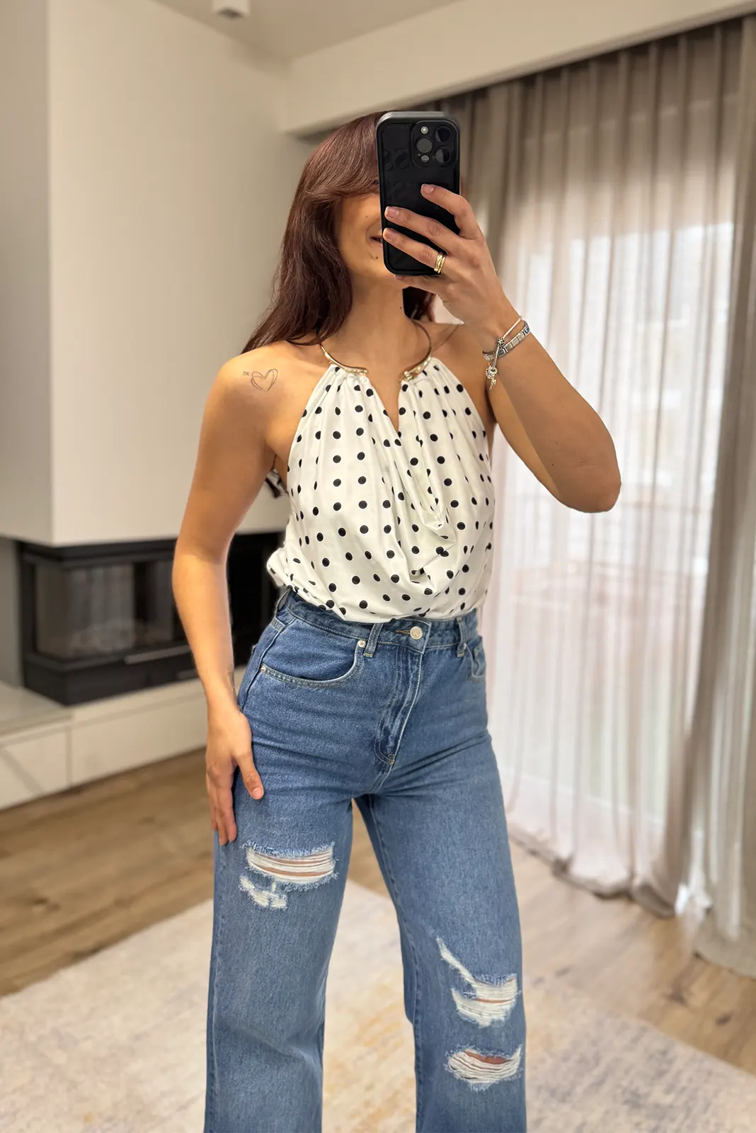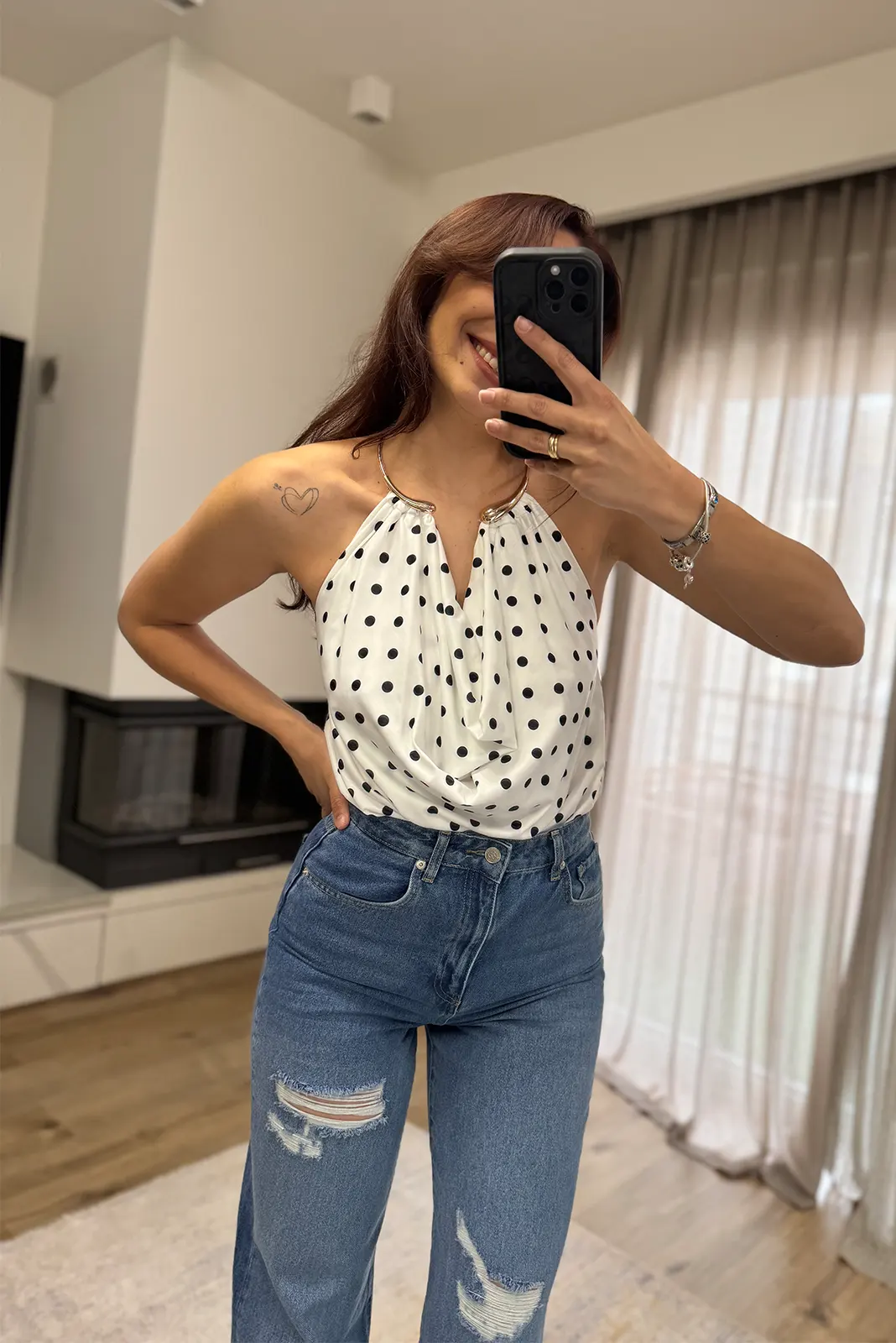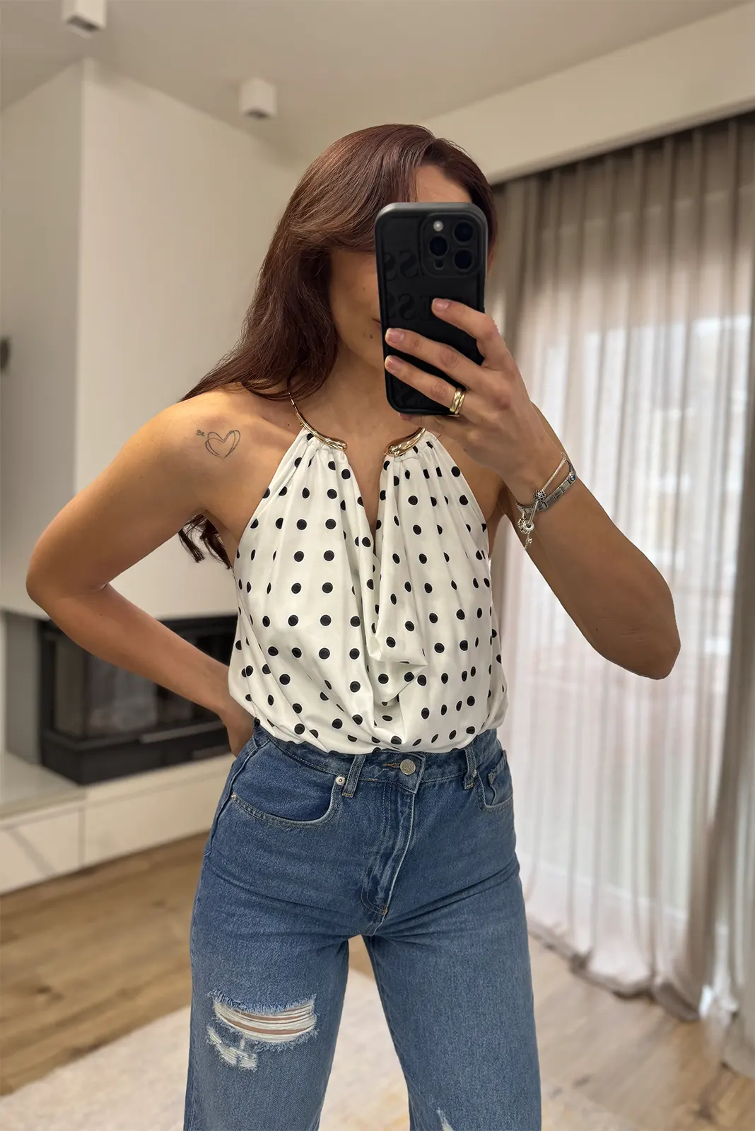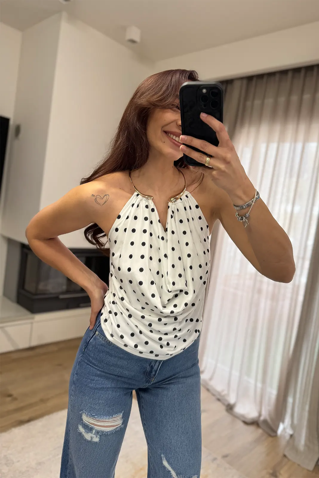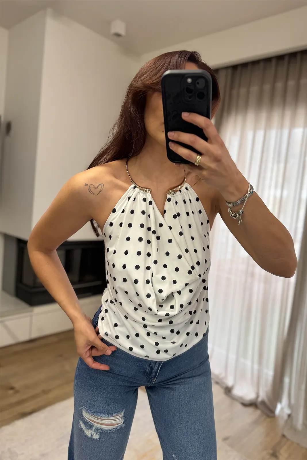Μπλούζα Πουά με Αξεσουάρ στο Λαιμό – Λευκό