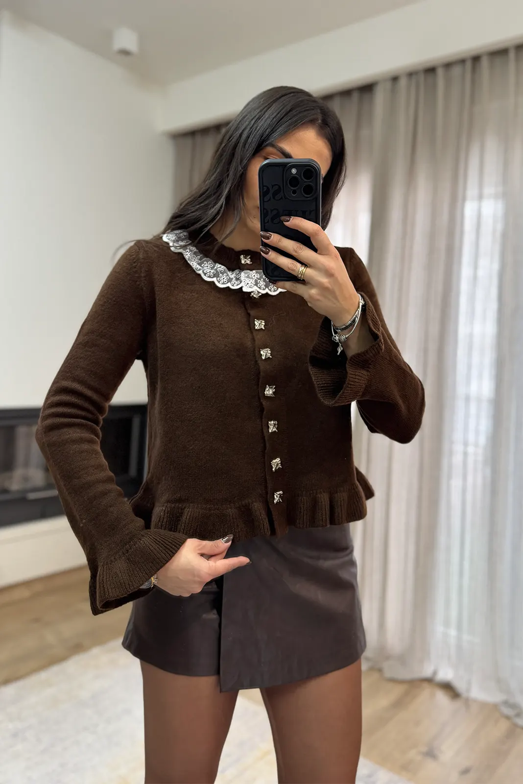 Πλεκτή Ζακέτα με Βολάν, Δαντέλα κ Ασημί Κουμπιά – Καφέ