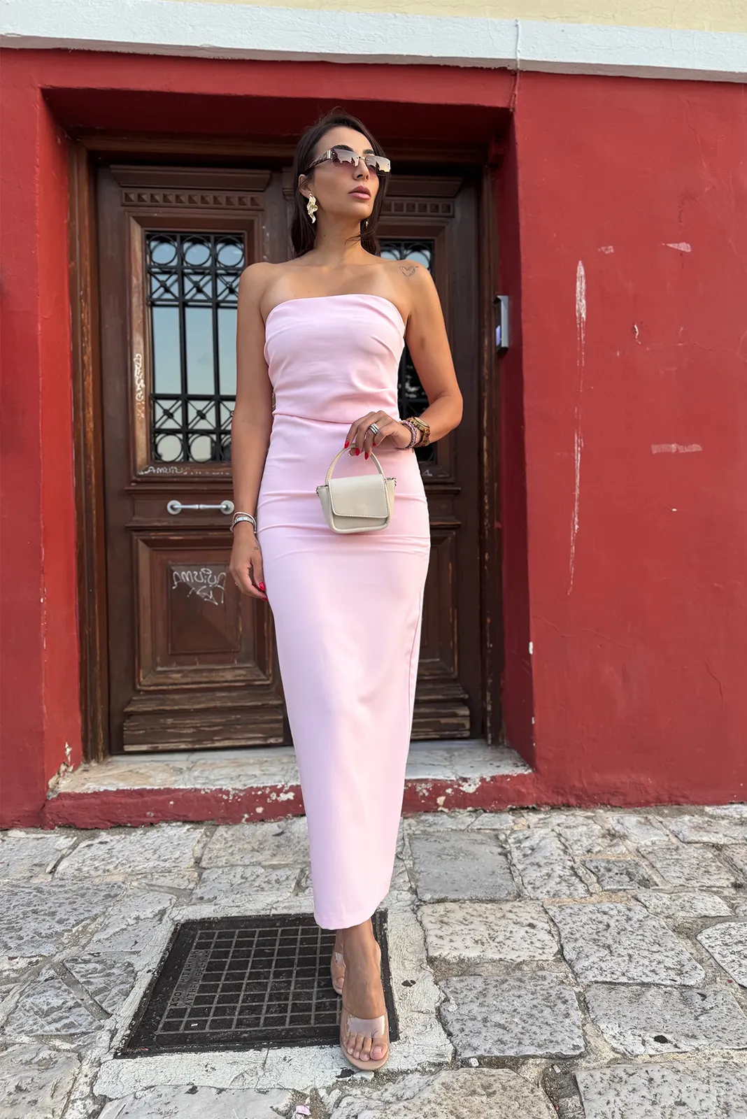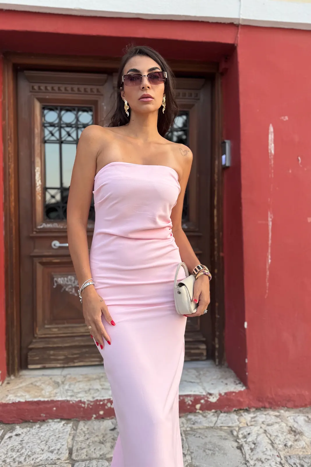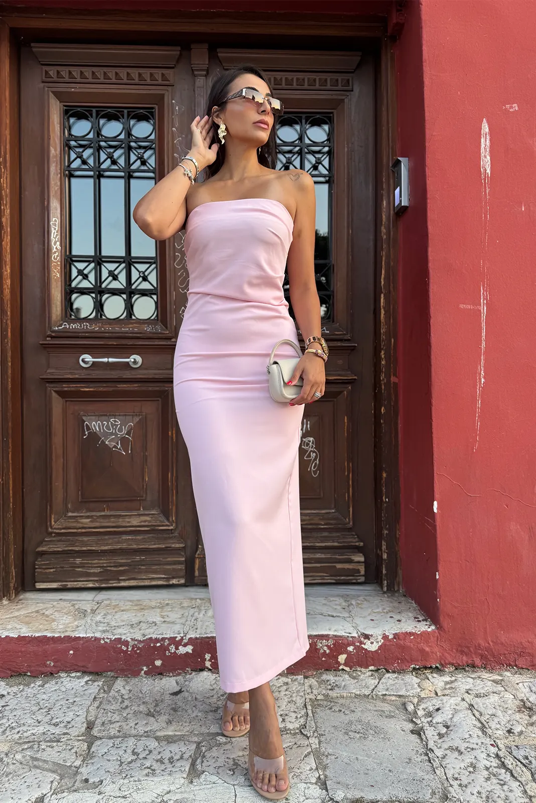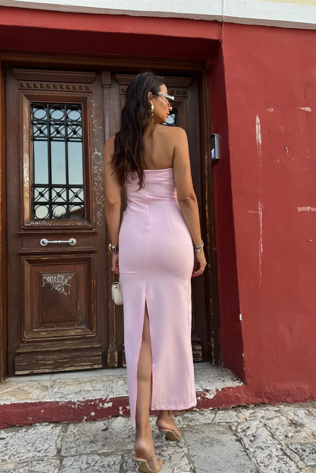 Στράπλες Φόρεμα με Σκίσιμο – Ροζ