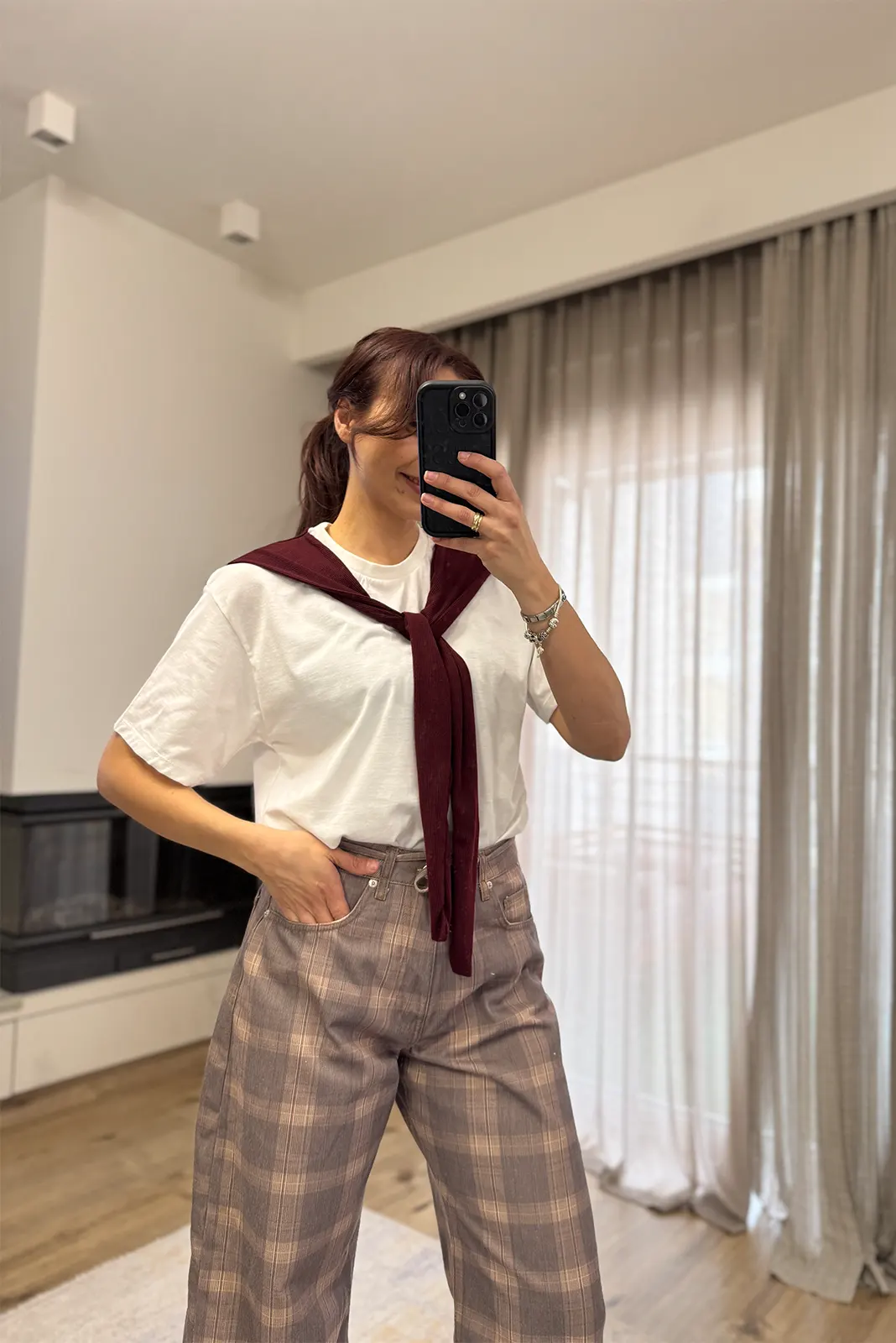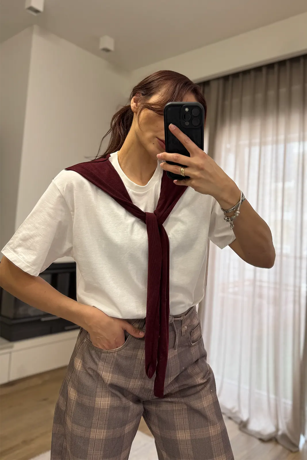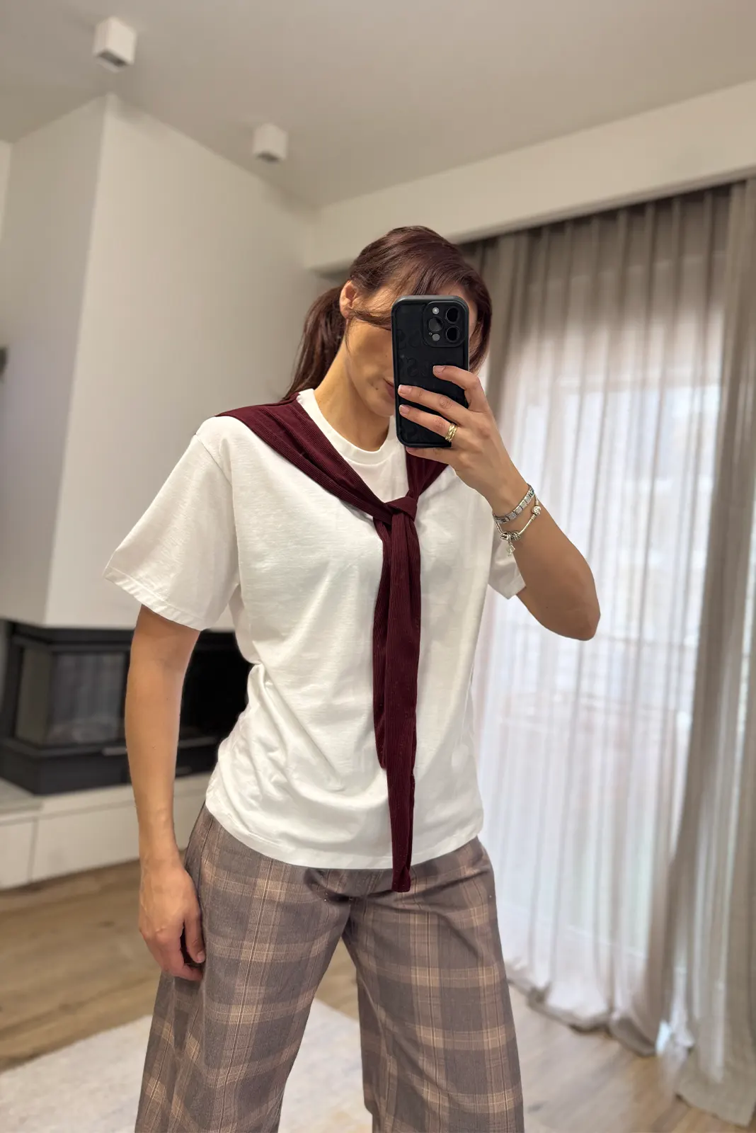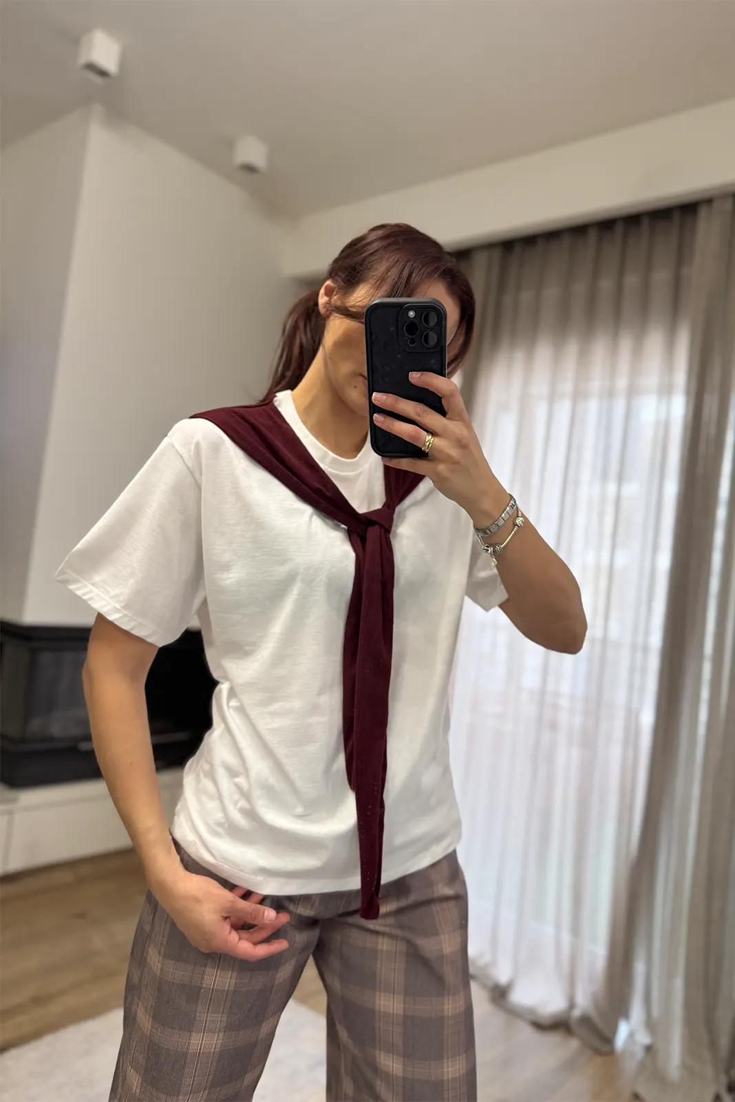 T-Shirt με Ενσωματωμένη Φουλάρι – Λευκό / Μπορντό